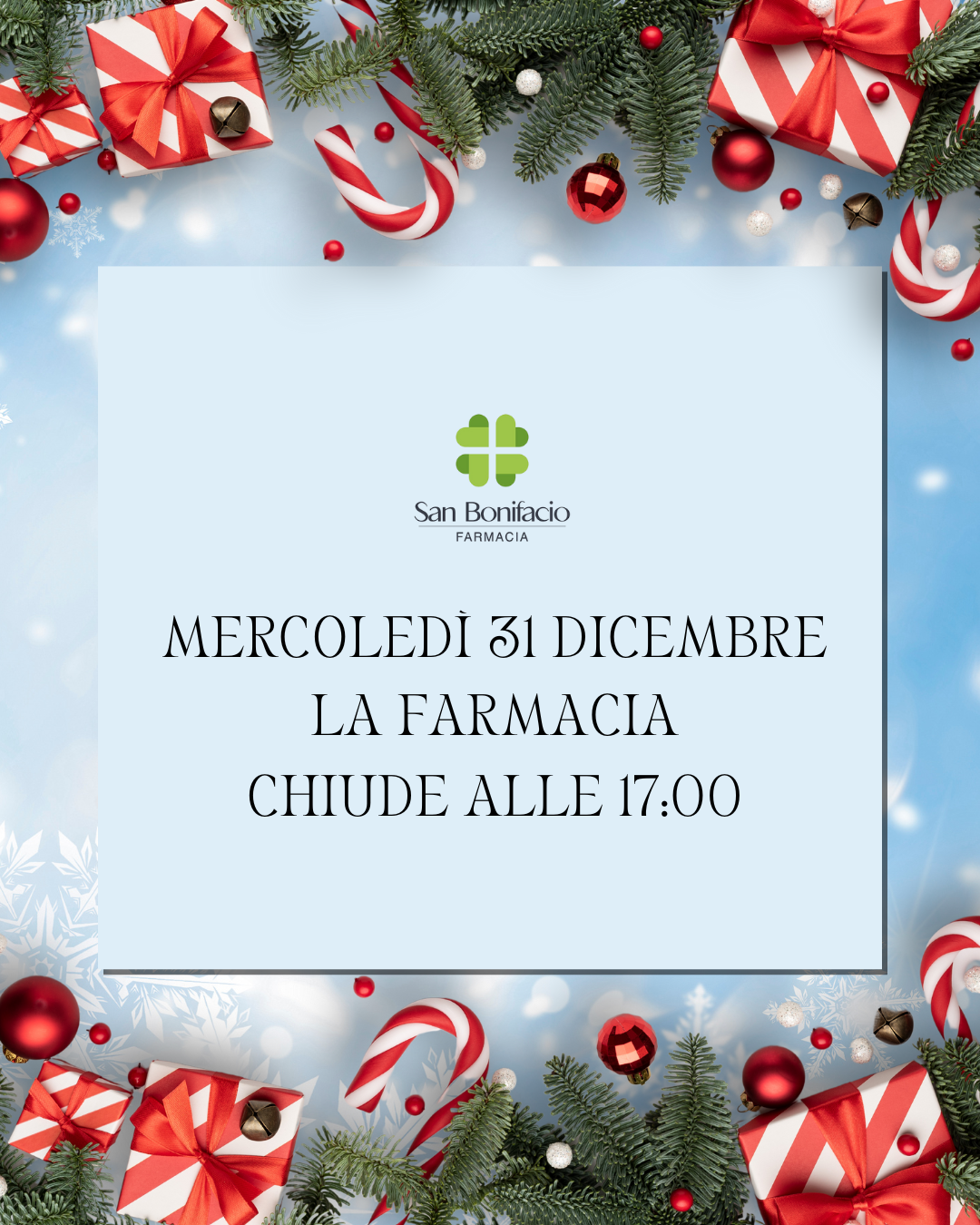 Mercoledì 31 dicembre la farmacia chiuderà alle ore 17:00